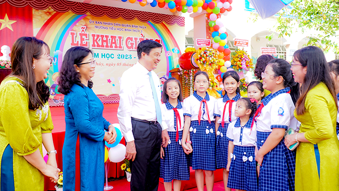 Đồng chí Phạm Văn Hiểu, Phó Bí thư Thường trực Thành ủy, Chủ tịch HĐND TP Cần Thơ, trò chuyện cùng giáo viên, học sinh Trường Tiểu học Bình Thủy 2, nhân ngày khai giảng năm học 2023-2024. Ảnh: B.NG