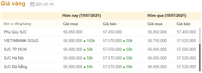 | Bảng cập nhật giá vàng sáng 19/7. (Ảnh chụp màn hình). |