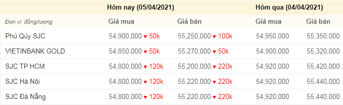 Trên thị trường vàng trong nước, mở cửa phiên giao dịch sáng nay, giá vàng trong nước giảm nhẹ. Cụ thể, vào lúc 9h15' sáng ngày 5/4, Tập đoàn Vàng bạc đá quý DOJI niêm yết giá vàng SJC khu vực Hà Nội ở mức 54,85 triệu đồng/lượng (mua vào) và 55,25 triệu đồng/lượng (bán ra), giảm 50.000 đồng/lượng (mua vào) và 150.000 đồng/lượng (bán ra) so với phiên giao dịch trước. Chênh lệch mua - bán là 400.000 đồng/lượng.