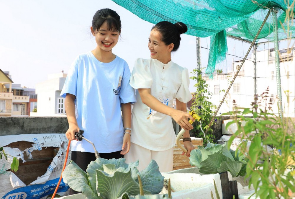 Chị Kim Huyền (quận Ninh Kiều) cùng con gái chăm sóc vườn rau.