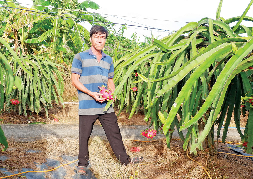 Ông Lê Văn Tèo (xã Dương Xuân Hội, huyện Châu Thành) chia sẻ: “Tôi tham gia Tổ hợp tác liên kết sản xuất thanh long sạch ấp Vĩnh Xuân A. Trồng thanh long sạch, tôi được Nhà nước hỗ trợ kinh phí xây dựng nhà kho chứa phân bón, thuốc theo quy định. Ngoài ra, tôi cũng được HTX hướng dẫn kỹ thuật trồng thanh long sạch, ghi chép nhật ký sản xuất. Hiện tại, tôi có khoảng 3.000m2 đất trồng thanh long sạch. Nhờ áp dụng khoa học - kỹ thuật mà việc trồng thanh long của tôi đỡ vất vả, trái thanh long đạt chất lượng tốt hơn”.
