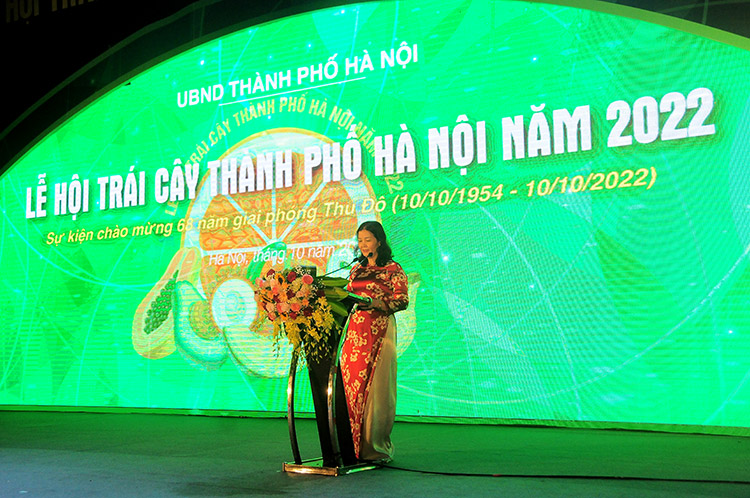 Phát biểu khai mạc “Lễ hội trái cây Thành phố Hà Nội năm 2022”, bà Trần Thị Phương Lan - Quyền Giám đốc Sở Công thương Hà Nội cho biết: Hà Nội có dân số trên 10,7 triệu người sinh sống, học tập, làm việc nhu cầu tiêu dùng các sản phẩm nông sản thực phẩm an toàn của Thành phố rất lớn, trong đó trái cây là một trong những sản phẩm thiết yếu được người dân mua sắm và tiêu dùng hàng ngày. Qua khảo sát, nhu cầu tiêu dùng mặt hàng trái cây trên địa bàn Hà Nội khoảng 52.000 tấn/tháng, trong đó nguồn cung trên địa bàn đáp ứng khoảng 35% nhu cầu. Hệ thống phân phối mặt hàng trái cây trên địa bàn đa dạng gồm 29 trung tâm thương mại, 112 siêu thị kinh doanh tổng hợp, 453 chợ với khoảng 4.050 hộ có kinh doanh trái cây, 1.872 cửa hàng kinh doanh trái cây trên các tuyến phố, khu dân cư, 65 cửa hàng giới thiệu sản phẩm OCOP.