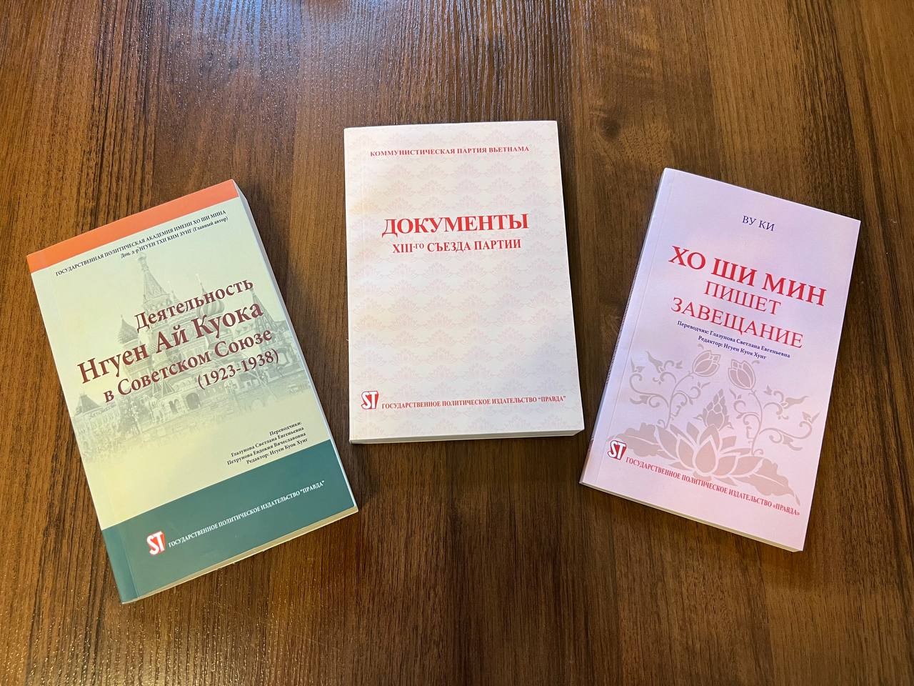 | 3 văn kiện lịch sử của Việt Nam sang tiếng Nga: sách Hoạt động của Nguyễn Ái Quốc ở Liên Xô (1923 – 1938), Văn kiện Đại hội đại biểu toàn quốc lần thứ XIII của Đảng Cộng sản Việt Nam và hồi ký Bác Hồ viết di chúc. (Ảnh: thoidai.com.vn) |
