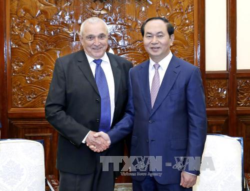 Chủ tịch nước Trần Đại Quang tiếp Ngài Yitzhak Aharonovitch, Chủ tịch Tập đoàn IMI System Ltd của Israel. (Ảnh: Nhan Sáng - TTXVN)