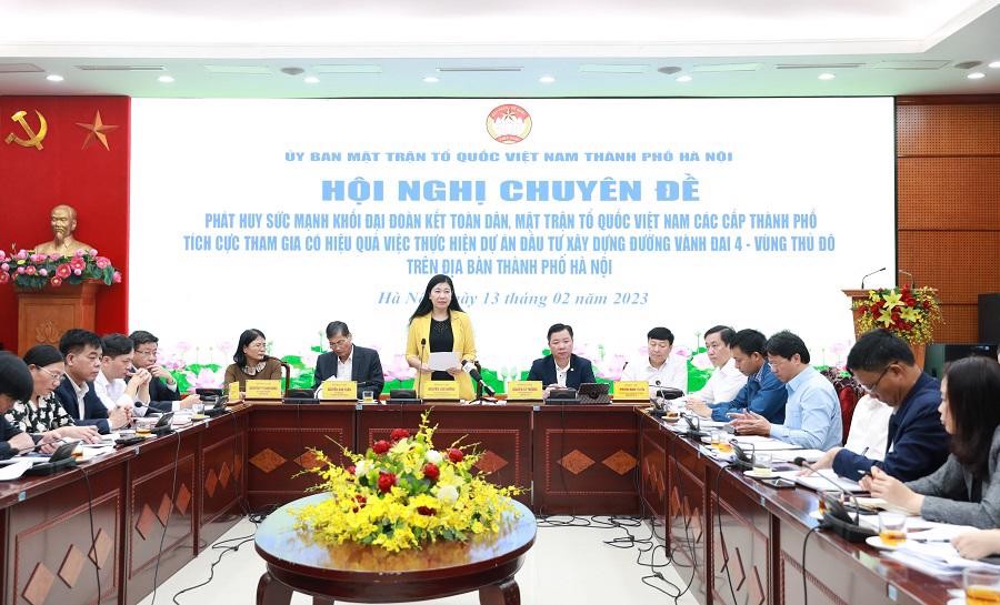 Sáng 13/2, Ủy ban Mặt trận Tổ quốc (MTTQ) Việt Nam thành phố (TP) Hà Nội tổ chức Hội nghị chuyên đề “Phát huy sức mạnh khối đại đoàn kết toàn dân, MTTQ Việt Nam các cấp thành phố tích cực tham gia có hiệu quả việc thực hiện Dự án Đầu tư xây dựng đường Vành đai 4 - Vùng Thủ đô trên địa bàn TP Hà Nội”.