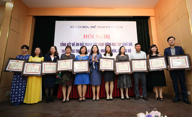 | Bộ Văn hóa, Thể thao và Du lịch khen thưởng các điển hình tiên tiến, có đóng góp tích cực trong việc khuyến khích và nhân rộng các mô hình học tập suốt đời. (Ảnh: Thanh Tùng/TTXVN) |