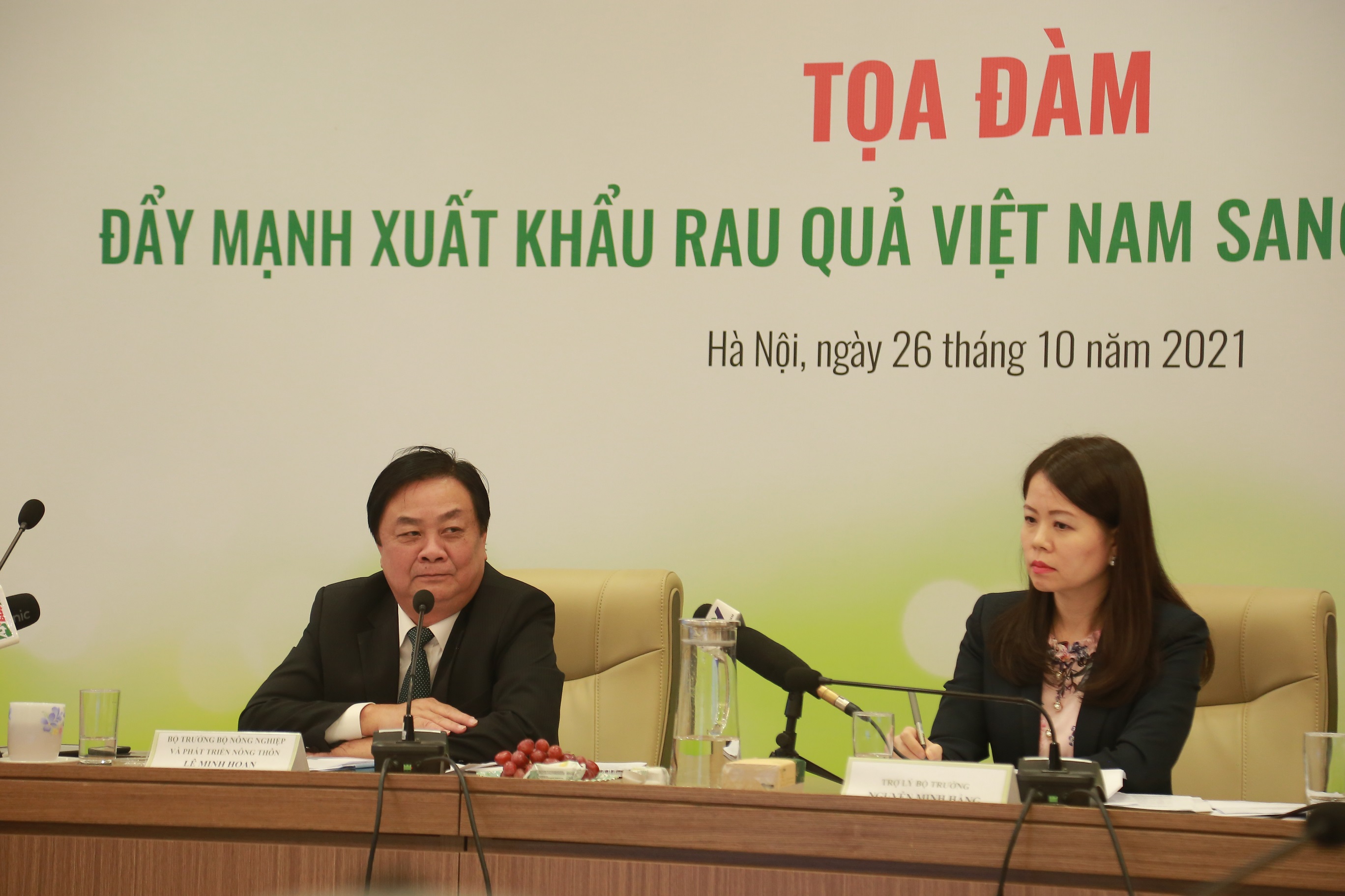 Phát biểu kết luận Tọa đàm, Bộ trưởng Bộ Nông nghiệp và Phát triển Nông thôn Lê Minh Hoan đánh giá cao sáng kiến của Bộ Ngoại giao về tổ chức Tọa đàm. Bộ trưởng nhận định thị trường EU còn nhiều tiềm năng và nhấn mạnh đã đến lúc các bộ, ngành, địa phương và doanh nghiệp cần phối hợp xây dựng một chiến lược tổng thể và kế hoạch hành động để đẩy mạnh xuất khẩu rau quả sang thị trường này. Theo Bộ trưởng, ba trở ngại lớn nhất đối với nông sản Việt Nam khi vươn ra thế giới là biến đổi khí hậu, biến động thị trường và biến chuyển trong xu thế tiêu dùng, trong đó thế giới đang mạnh mẽ chuyển sang sản xuất và tiêu dùng xanh. Do vậy, chiến lược thúc đẩy xuất khẩu nông sản Việt Nam sang EU cần được xây dựng tổng thể và toàn diện, tiến tới định vị thương hiệu mới của nông nghiệp Việt Nam là minh bạch, trách nhiệm và bền vững. Bộ trưởng khẳng định, phải thay đổi tư duy theo hướng “muốn đi nhanh đi một mình, đi xa phải đi cùng nhau”, các doanh nghiệp cần tăng cường phối hợp, hình thành các liên minh, hiệp hội để cùng quảng bá cho thương hiệu rau quả và nông sản của quốc gia.