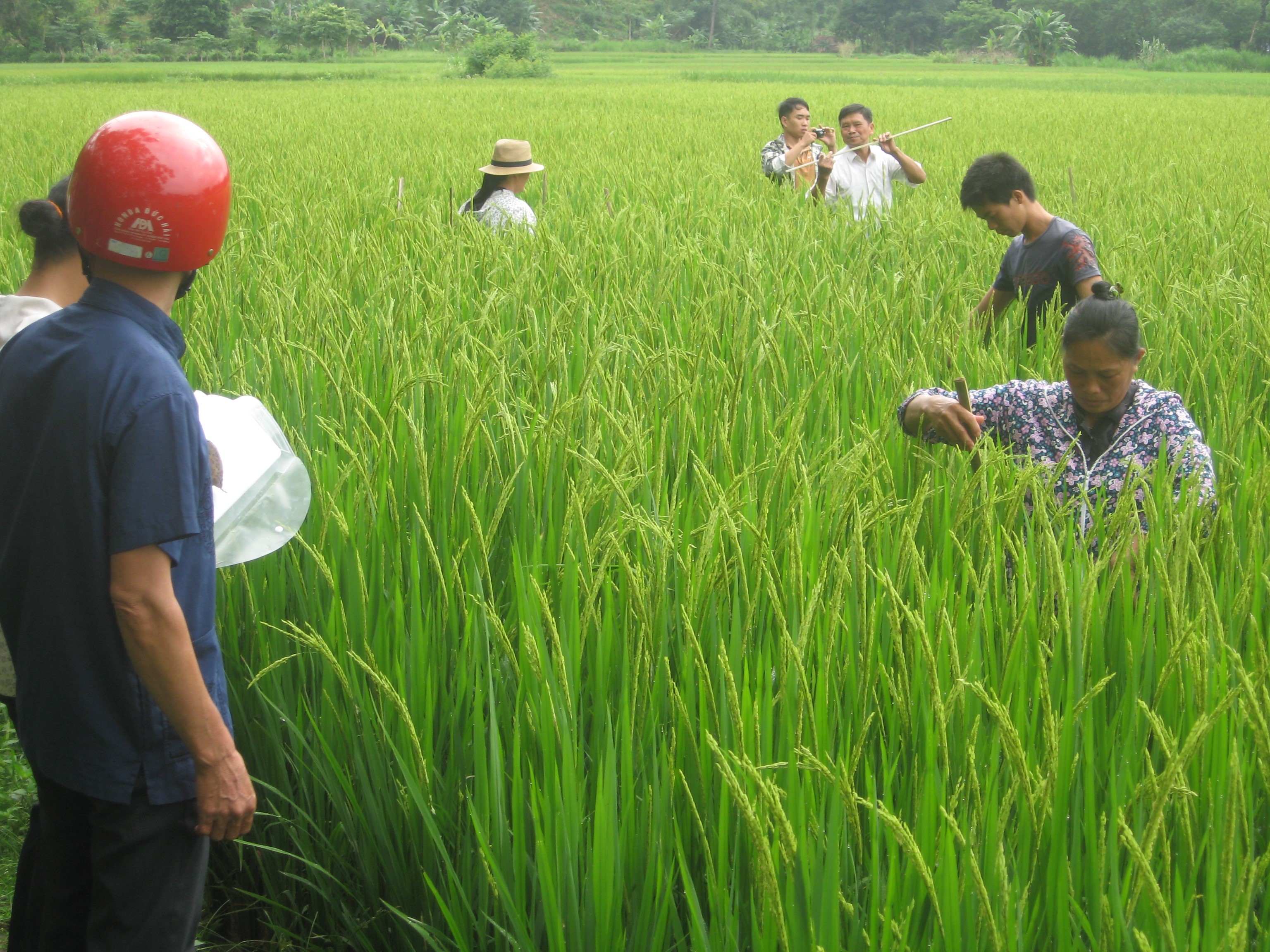 | Giờ thực hành điều tra hệ sinh thái và sâu bệnh hại lúa của lớp dạy nghề cho lao động nông thôn huyện Bắc Mê. |