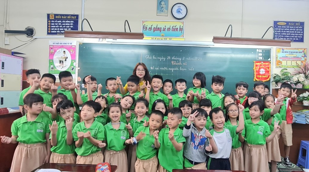 | Cô Đặng Hà Phương và tập thể các em học sinh lớp 1/9 Trường tiểu học Kỳ Đồng. |