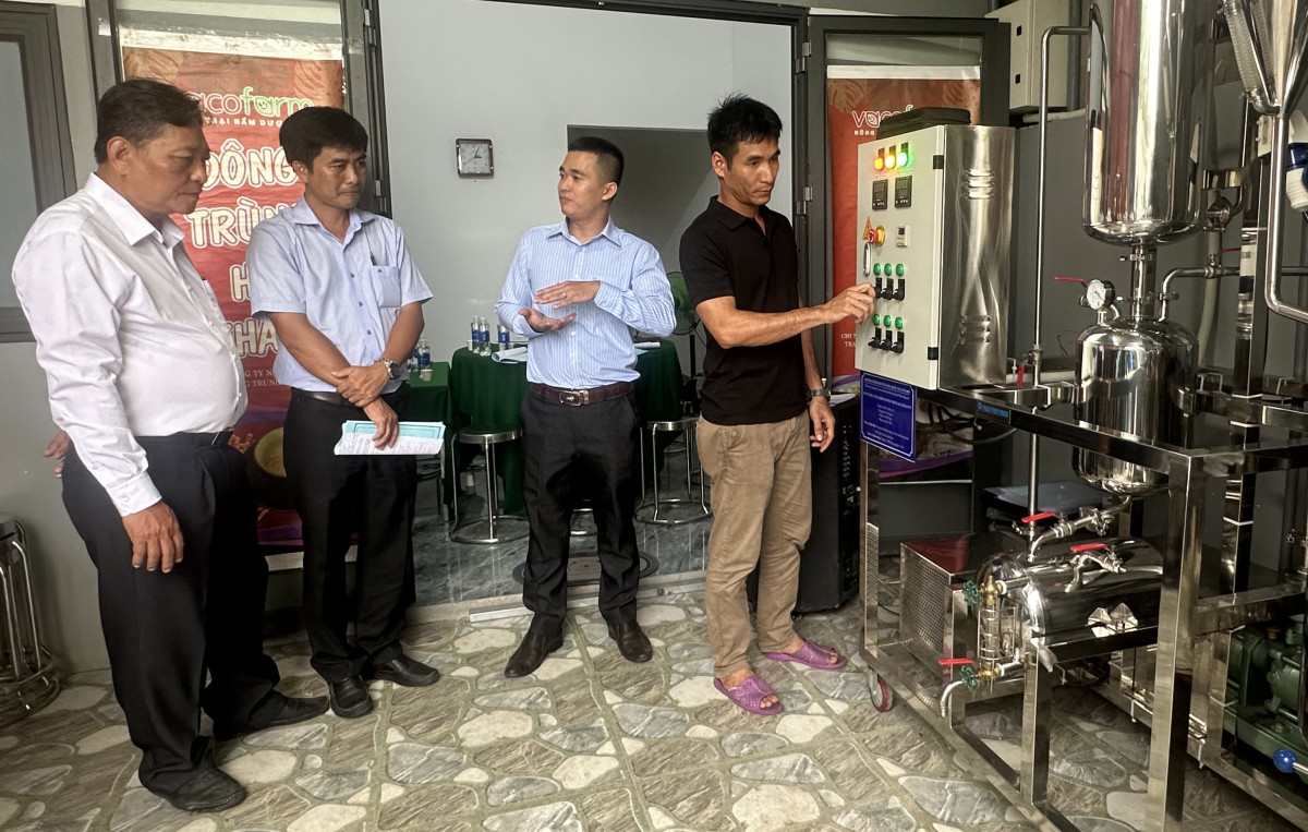 Lãnh đạo Sở Công Thương, Trung tâm Khuyến công và Xúc tiến thương mại tỉnh, Công ty TNHH Nông nghiệp VaCo (huyện Bến Lức) nghiệm thu, trình diễn máy chiết xuất đông trùng hạ thảo