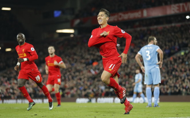 Tiền đạo Roberto Firmino ăn mừng bàn nâng tỉ số lên 2-1 cho Liverpool. Ảnh: Reuters