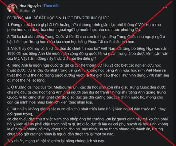 | Thông tin xuyên tạc trên mạng xã hội liên quan giảng dạy tiếng Trung Quốc. |