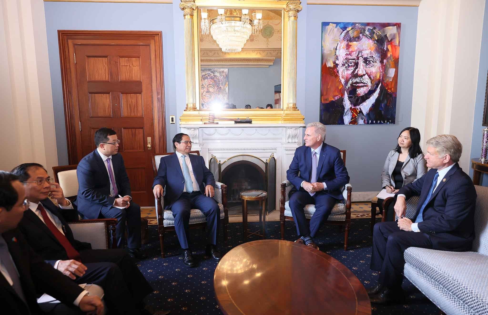 Chủ tịch Hạ viện Hoa Kỳ Kevin McCarthy và Chủ tịch Ủy ban Đối ngoại Hạ viện Michael McCaul bày tỏ vui mừng được đón Thủ tướng Chính phủ Phạm Minh Chính thăm trụ sở Hạ viện Hoa Kỳ, đánh giá cao về kết quả chuyến thăm Việt Nam của Tổng thống Biden và bày tỏ vui mừng khi hai nước xác lập khuôn khổ quan hệ mới.