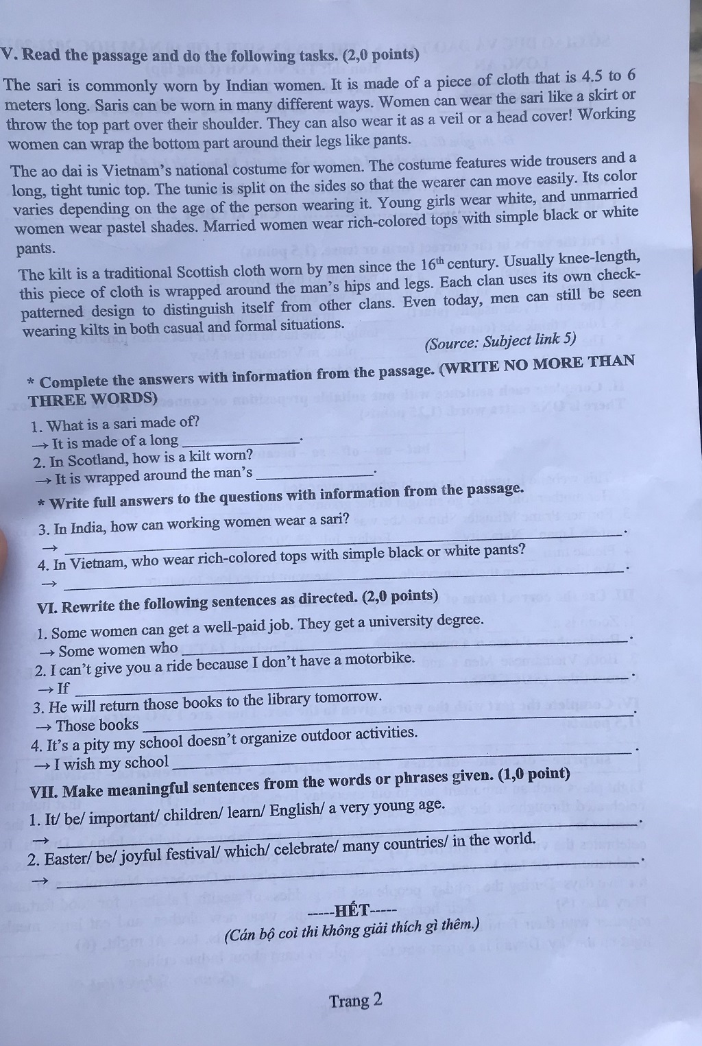 Nhận xét về đề thi, thầy Nguyễn Thanh Tuấn, giáo viên môn Tiếng Anh, Trường THCS Thị Trấn Tân Hưng (huyện Tân Hưng) cho biết: “Đề thi Tiếng Anh năm nay bám sát cấu trúc đề thi Sở Giáo dục và Đào tạo ban hành, phù hợp với điều kiện dạy và học trực tuyến và trực tiếp. Đề thi có các câu hỏi về chia dạng động từ, giới từ và liên từ khá dễ. Chủ đề của các bài đọc hiểu về một số loại trang phục và lễ hội Diwali khá thú vị, từ vựng không mang tính hàn lâm, văn phong viết cơ bản dễ hiểu. Các bài đọc đều có trích dẫn nguồn, có độ tin cậy cao. Phần chuyển đổi câu ở mức cơ bản, nằm trong chương trình học. Tuy nhiên, phần thành lập câu theo gợi ý mang tính phân loại, đòi hỏi thí sinh phải có kiến thức ngữ pháp vững chắc mới làm tốt được. Ngoài ra, đề thi có liên hệ thực tế với một số sự kiện nổi bật diễn ra gần đây như vụ việc cựu Thủ tướng Shinzo Abe bị ám sát, kỳ Sea Games 31 tại Việt Nam và việc học trực tuyến qua Ứng dụng Zoom”.