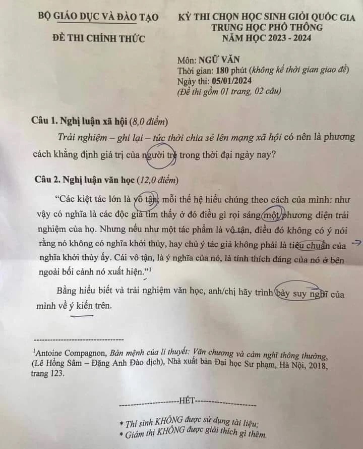 Đề Văn chọn học sinh giỏi quốc gia gây được sự chú ý đối với dư luận.