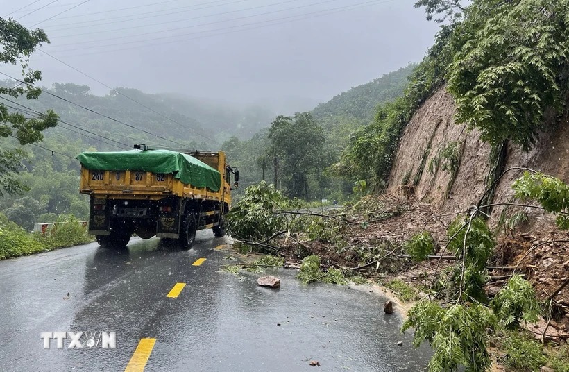 Mưa lớn gây sạt lở trên tỉnh lộ 156B ở huyện Bát Xát (Lào Cai). (Ảnh: Quốc Khánh/ TTXVN)