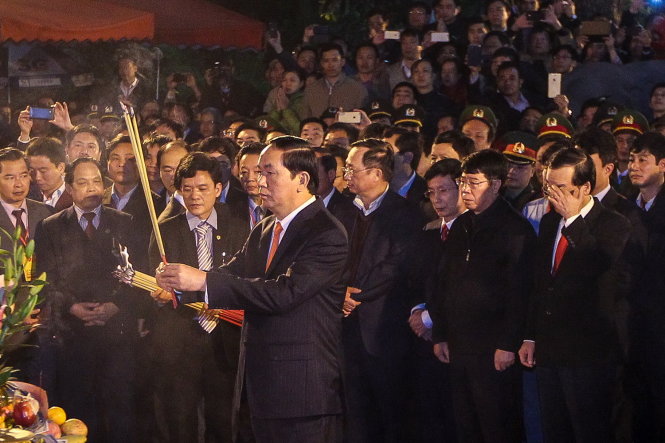 Đại tướng Trần Đại Quang - Uỷ viên Bộ chính trị, Bộ trưởng Bộ công an thắp hương tại đền Thiên Trường trước giờ khai ấn - Ảnh: Nguyễn Khánh
