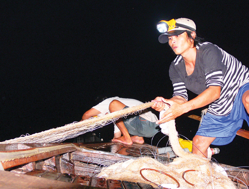 Màn đêm buông dài trên khúc sông Vàm Nao, tiếng máy chạy lạch cạch, tiếng chèo khua nước, tiếng “í ới” gọi nhau… xua tan nỗi buồn tẻ và cô liêu. Chiếc xuồng tam bản cỡ lớn của anh Nguyễn Văn Giang (ngụ ở huyện Phú Tân, An Giang) chất đầy lưới, đèn báo hiệu đưa chúng tôi từ bến phà Thuận Giang lên tuyến đầu phía trên chợ Phú Mỹ.