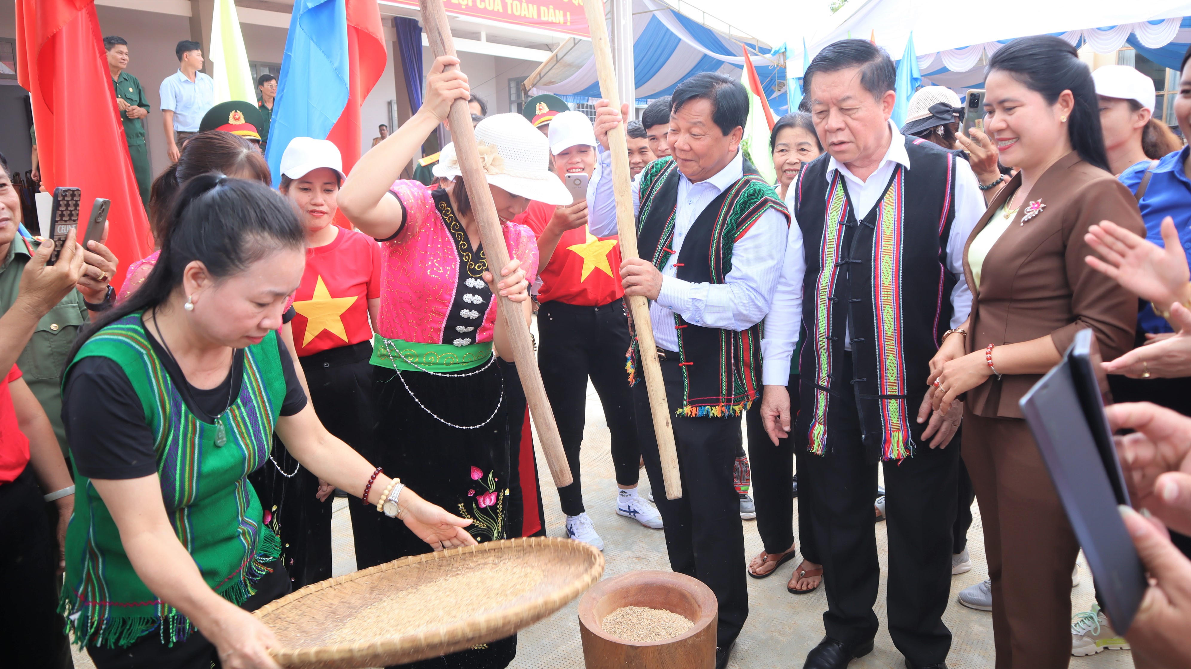 | Trưởng Ban Tuyên giáo Trung ương Nguyễn Trọng Nghĩa (thứ 2 từ phải qua) và các đồng chí lãnh đạo tham gia các hoạt động văn hoá của đồng bào dân tộc tỉnh Bình Phước. (Ảnh: AN) |