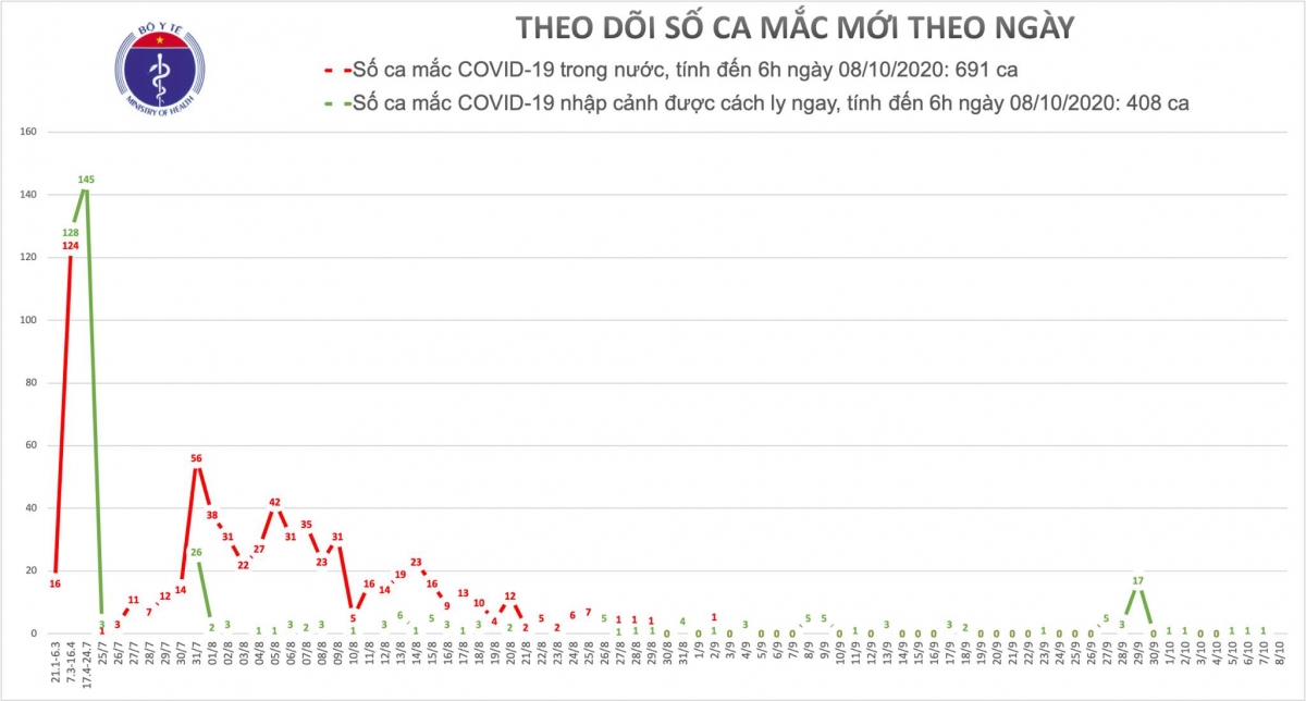 Đến nay, Việt Nam có 691 ca mắc COVID-19 do lây nhiễm trong nước, trong đó số lượng ca mắc mới tính từ ngày 25/7 đến nay là 551 người. Tính từ 18h chiều 7/10 đến 6h sáng 8/10, cả nước không có ca mắc mới.