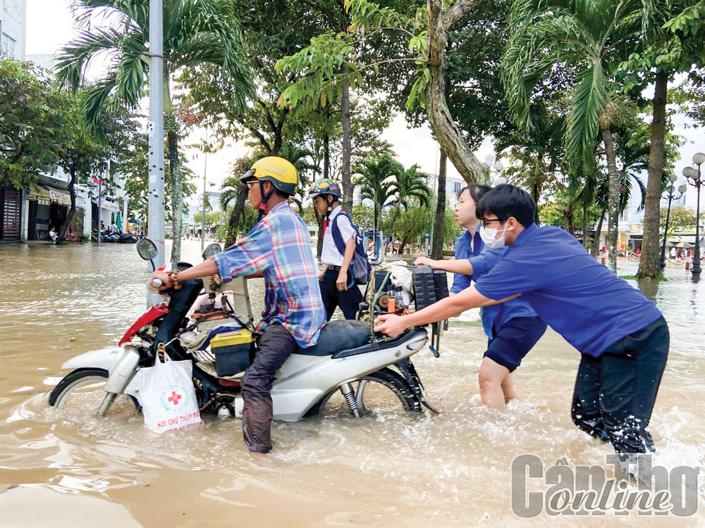Tuổi trẻ phường An Cư, quận Ninh Kiều, hỗ trợ bà con lưu thông an toàn qua điểm ngập do ảnh hưởng triều cường.