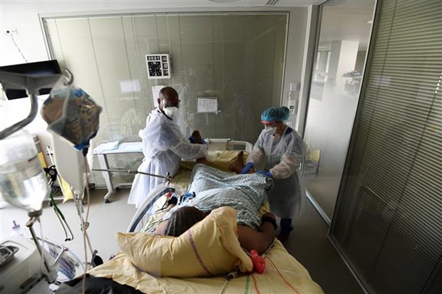 Điều trị cho bệnh nhân nhiễm COVID-19 tại bệnh viện gần Paris, Pháp. (Ảnh: AFP/TTXVN)
