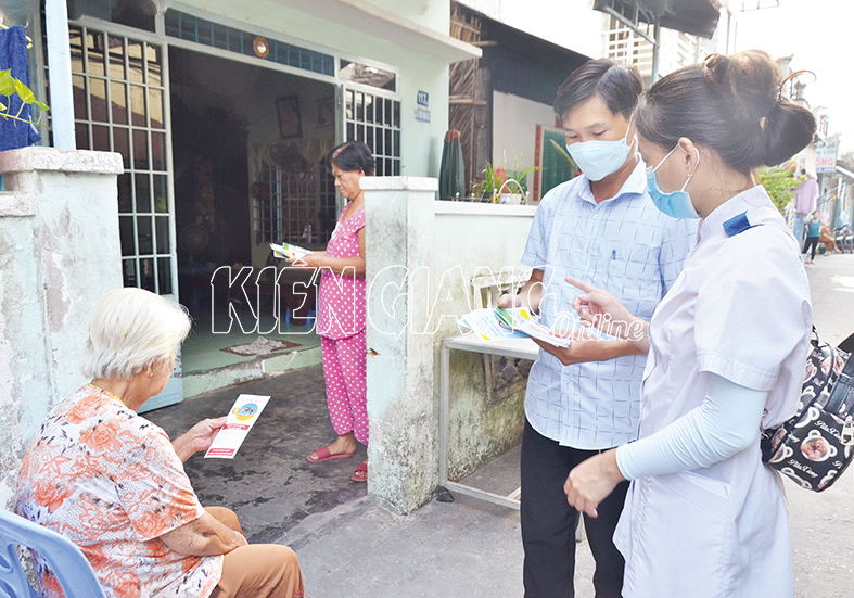 Phát tờ rơi tuyên truyền biện pháp phòng, chống bệnh sốt xuất huyết đến người dân tại phường Vĩnh Thanh Vân, TP. Rạch Giá (Kiên Giang)