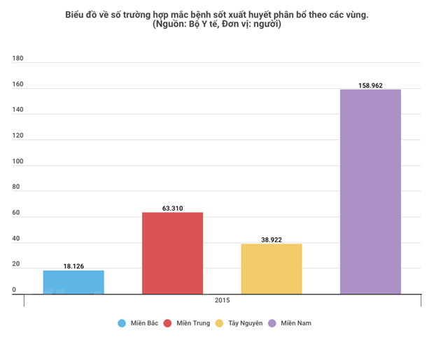 Miền Nam có số trường hợp mắc bệnh sốt xuất huyết cao nhất trong cả nước (với gần 159.000 trường hợp), tiếp sau đó là miền Trung (hơn 61.000 trường hợp), Tây Nguyên (hơn 38.900 trường hợp), miền Bắc (hơn 18.000 trường hợp).