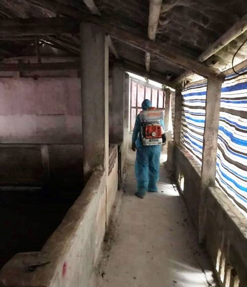 | Phun thuốc tiêu độc, khử trùng xung quanh khu vực có dịch tả lợn châu Phi (Ảnh: KL) |