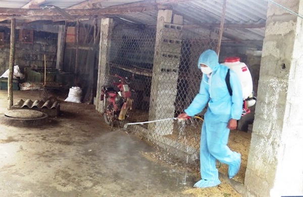 | Phun hóa chất khử trùng tiêu độc ở những nơi có lợn mắc dịch. (Ảnh: Đình Tăng) |