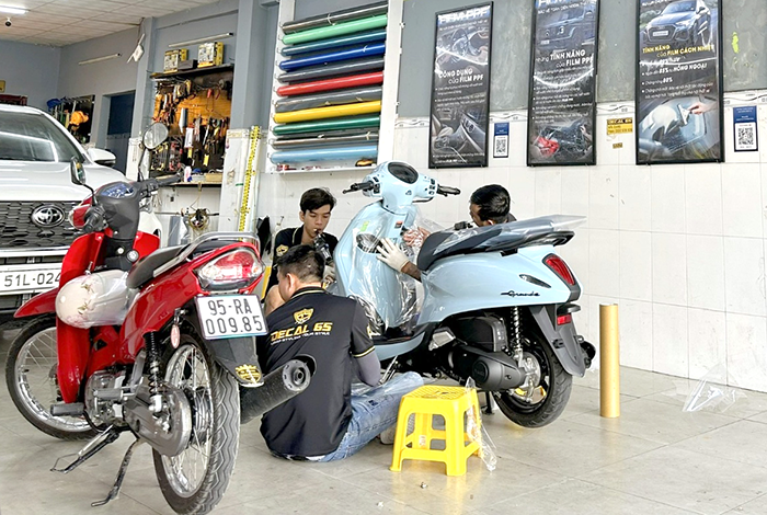 Các dịch vụ sơn, dán xe được nhiều chủ xe lựa chọn để tân trang lại vẻ ngoài, làm mới cho xe. Đối với sơn xe, màu sắc đa dạng từ sơn bóng, mờ đến sơn candy, carbon… Tùy theo nhu cầu và túi tiền, khách hàng chọn xử lý trầy xước, sơn dặm hoặc sơn mới nguyên xe. Dán keo bảo vệ chống trầy giúp tạo một lớp màng bảo vệ bên ngoài, hạn chế tối đa các va quẹt nhẹ, trầy xước do cọ sát trong quá trình sử dụng. Không chỉ giúp giữ bề mặt sơn và nhựa xe luôn như mới, dán keo còn giúp xe dễ vệ sinh, ít bám bẩn và giữ được tính thẩm mỹ. Bảo dưỡng xe máy thường có các hạng mục như thay nhớt, kiểm tra phanh, hệ thống điện, bugi, lọc gió, lốp xe… kịp thời thay thế các chi tiết hư hỏng, trục trặc của xe. Qua đó, giúp đảm bảo an toàn, trơn tru khi vận hành cũng như tăng tuổi thọ sử dụng của xe máy. Giá các dịch vụ bảo dưỡng, làm đẹp xe dao động từ vài trăm ngàn đồng đến vài triệu đồng/chiếc, tùy theo sử dụng loại dịch vụ hoặc theo từng dòng xe.