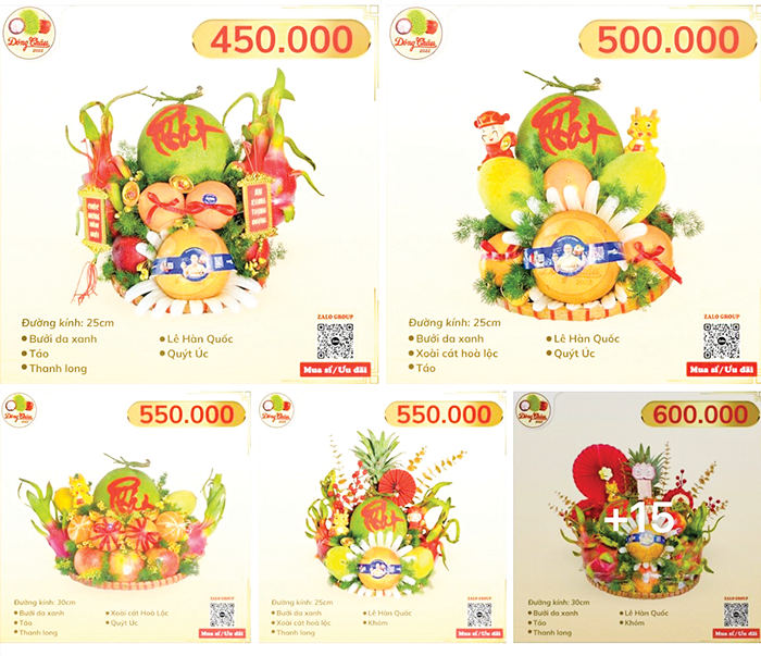 Theo khảo sát, các mâm ngũ quả gồm các loại quả truyền thống như xoài, dừa, mãng cầu, bưởi, thanh long, quýt... Bên cạnh đó, mâm ngũ quả cũng được biến tấu với một số loại trái cây ngoại như dưa lưới, táo, lê, cam… Để làm mới mâm ngũ quả, các cửa tiệm còn bổ sung các sản phẩm trái cây có dán chữ, điểm tô thêm hoa (tươi hoặc giả) và phụ kiện trên mỗi mâm ngũ quả. Cùng đó, cửa hàng cũng triển khai các sản phẩm theo yêu cầu của khách với nhiều mức giá. Các mâm ngũ quả nhỏ gọn giá từ 350.000-700.000 đồng/mâm; những mâm ngũ quả có kích thước lớn, trang trí cầu kỳ, giá từ 800.000 đồng lên đến 1-2 triệu đồng/mâm. Khách hàng có thể chọn dịch vụ giao hàng tận nơi có thu phí, hoặc tự đến lấy…