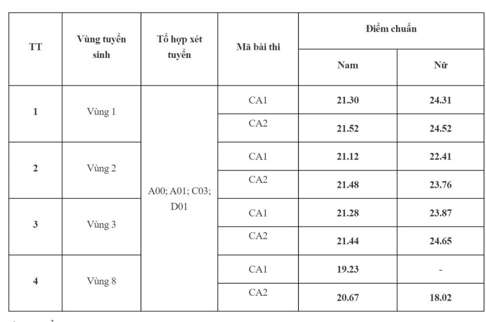 Điểm chuẩn với thí sinh nam dao động 20,67 - 21,52, cao nhất là đối tượng vùng 1 mã bài CA2. Với đối tượng nữ, điểm chuẩn 18,02 - 24,65 điểm, cao nhất vùng 3 mã bài CA2.