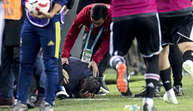 HLV Gunes gục xuống sân sau khi bị CĐV ném vật cứng. Ảnh: EPA
