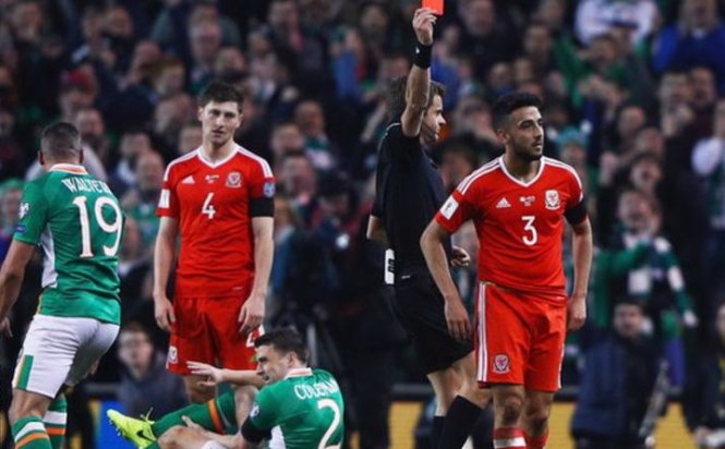 Hậu vệ Neil Taylor (3) nhận thẻ đỏ sau pha vào bóng khiến cầu thủ CH Ireland gãy chân. Ảnh: GETTY IMAGES