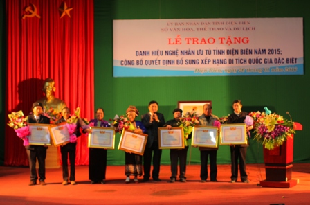 Ngày 13/11/2015, Chủ tịch nước ký quyết định số 2533/QĐ-CTN phong tặng danh hiệu “Nghệ nhân ưu tú” cho 600 nghệ nhân trên toàn quốc, tỉnh Điện Biên vinh dự có 8 nghệ nhân được trao tặng danh hiệu “Nghệ nhân ưu tú ” gồm: Ông Hoàng Thím, bà Lường Thị May (nắm giữ, truyền dạy nghệ thuật trình diễn dân gian); bà Lường Thị Đại (nắm giữ, truyền dạy tiếng nói, chữ viết, tập quán xã hội và tín ngưỡng); ông Mào Văn Ết (nắm giữ, truyền dạy nghệ thuật trình diễn và tri thức dân gian); ông Vàng Văn Thức (nắm giữ, truyền dạy nghệ thuật trình diễn dân gian và tập quán xã hội, tín ngưỡng); ông Giàng A Sử (nắm giữ, truyền dạy tri thức dân gian); Hù Văn Sẩm (nắm giữ, truyền dạy ngữ văn dân gian, tập quán xã hội và tín ngưỡng, lễ hội truyền thống); Pờ Dần Sinh (nắm giữ, truyền dạy nghệ thuật trình diễn dân gian, tập quán xã hội, tín ngưỡng, lễ hội truyền thống).