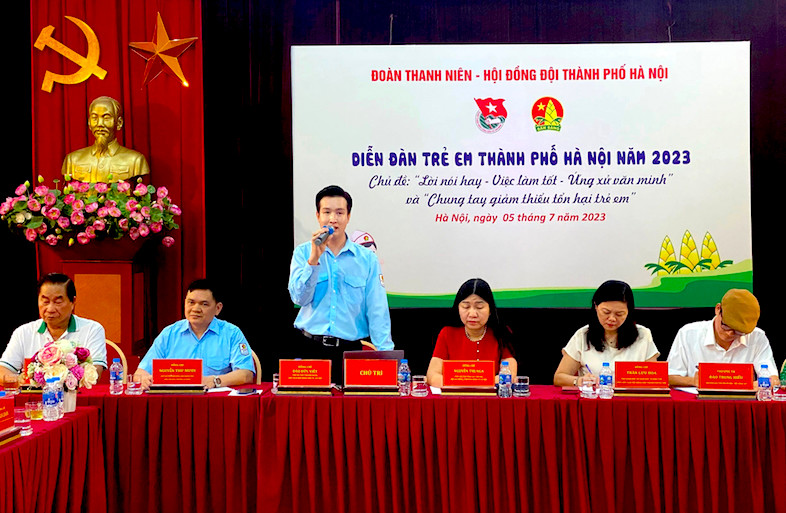Ngày 5/7, Thành đoàn, Hội đồng Đội thành phố Hà Nội tổ chức Diễn đàn trẻ em thành phố Hà Nội năm 2023 với chủ đề “Lời nói hay - Việc làm tốt - Ứng xử văn minh” và “Chung tay giảm thiểu tổn hại trẻ em”.