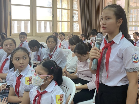 | Phó Bí thư Thành đoàn, Chủ tịch Hội đồng Đội thành phố Hà Nội Đào Đức Việt cùng các chuyên gia lắng nghe chia sẻ, giải đáp thắc mắc của thiếu nhi tại diễn đàn |