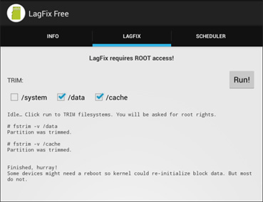 Nếu điện thoại của bạn xài phiên bản Android cũ, bạn có thể sử dụng lệnh TRIM thông qua ứng dụng Lagfix. Ứng dụng này có chức năng tương tự Fstrim trong Android 4.3.