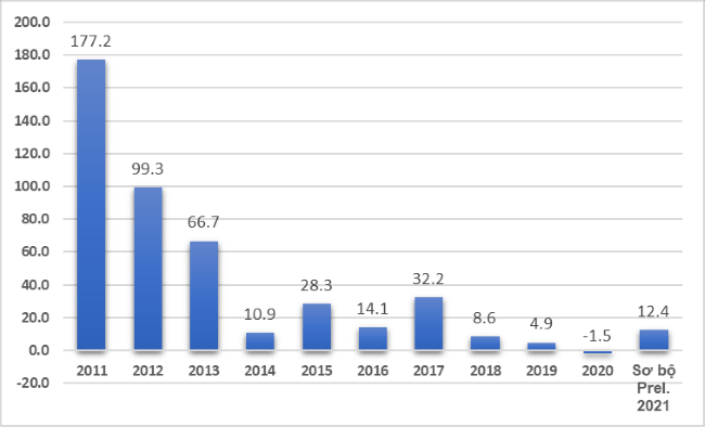 Cụ thể, theo số liệu của Tổng cục Thống kê, năm 2010, kim ngạch xuất khẩu nhóm hàng điện thoại và linh kiện chỉ đạt 2,3 tỷ USD, chiếm 3,2% tổng kim ngạch xuất khẩu. Trong suốt giai đoạn 2011 đến 2021, nhóm hàng điện thoại và linh kiện liên tục đạt tốc độ tăng cao. Bình quân cả giai đoạn 2011-2021 tăng 34%.