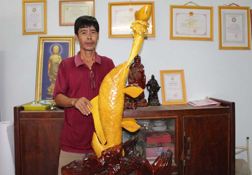 Một nghệ nhân điêu khắc với thế mạnh về các sản phẩm tượng cá chép, cá ngân long phong thủy và tượng Phật là anh Nguyễn Văn Dũng (sinh năm 1965), ngụ phường 6, TP.Tân An. Theo anh, tác phẩm điêu khắc phải hội tụ được cái “hồn”, cần có sự uyển chuyển cùng bố cục hợp lý. Muốn vậy, người thợ phải có óc quan sát, học hỏi và ghi nhớ từ thực tế cuộc sống. Để chạm một con cá ngân long hay cá chép, bắt buộc người thợ phải quan sát kỹ từ dáng bơi, vây, đuôi chuyển động thế nào, cách đớp mồi ra sao hay dáng đi đứng, ngồi, nằm, ánh mắt, nụ cười của tượng Phật, Quan Công,... phải tạo được sự thu hút cho người xem bằng những chi tiết sống động, chất chứa cái “hồn” của tác phẩm.