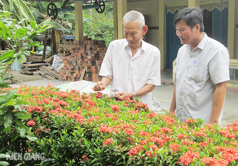 Đồng chí Bùi Quốc Việt (bên phải) - Bí thư Chi bộ, Trưởng ấp Hòa Thạnh, xã Định Hòa trao đổi với người dân về việc xây dựng hàng rào cây xanh trong xây dựng nông thôn mới.