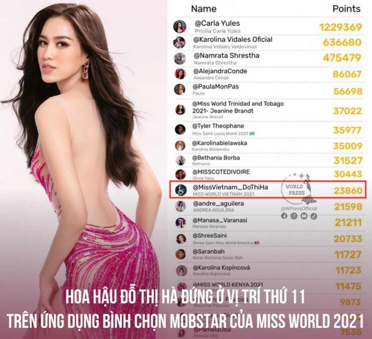 Chỉ còn 17 ngày nữa, Miss World 2021 sẽ chính thức diễn ra tại Puerto Rico. Hiện tại, BTC cuộc thi cũng đã bắt đầu khởi động những hoạt động đầu tiên. Trong đó, ứng dụng bình chọn chính thức đã được khởi động để cho khán giả vote cho thí sinh mà họ yêu thích. Sau ít ngày diễn ra, theo kết quả mới nhất được cập nhật trên ứng dụng, Hoa hậu Đỗ Thị Hà hiện đang đứng ở vị trí thứ 11 với tổng lượt bình chọn là 23.860.