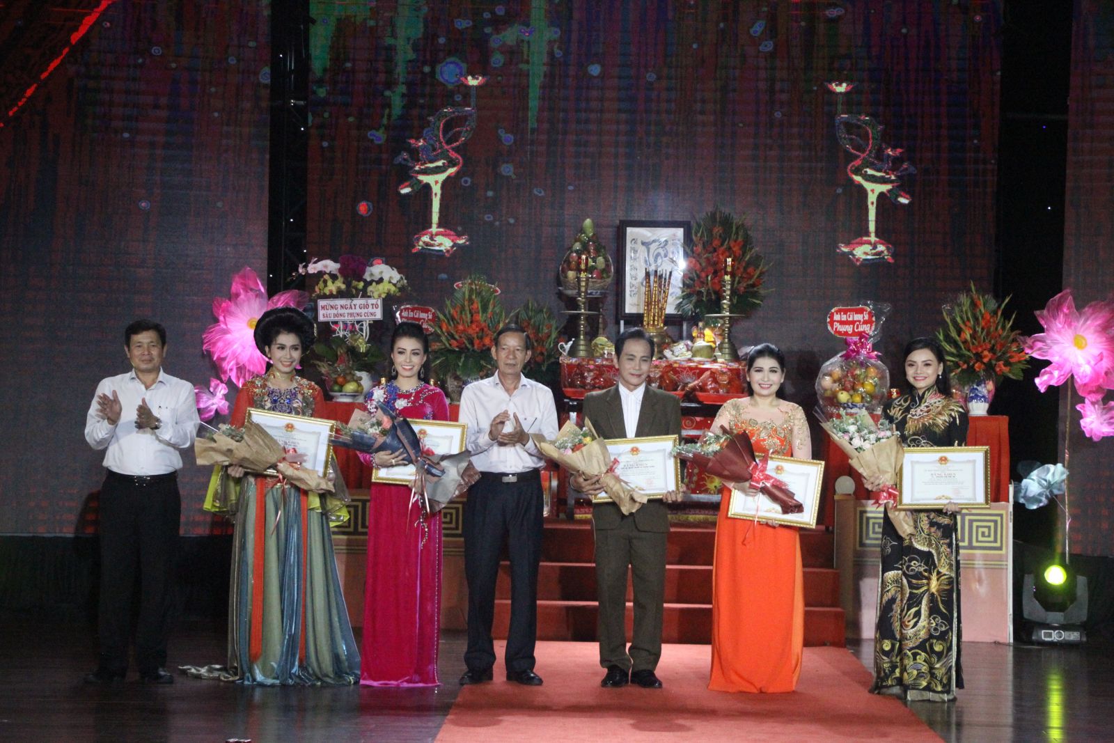 Trưởng Ban Tuyên giáo Tỉnh ủy - Đinh Ngọc Lâm và Phó Chủ tịch HĐND tỉnh - Mai Văn Nhiều trao bằng khen của UBND tỉnh cho các nghệ sĩ có thành tích cao trong vở diễn Chuyện của Dung