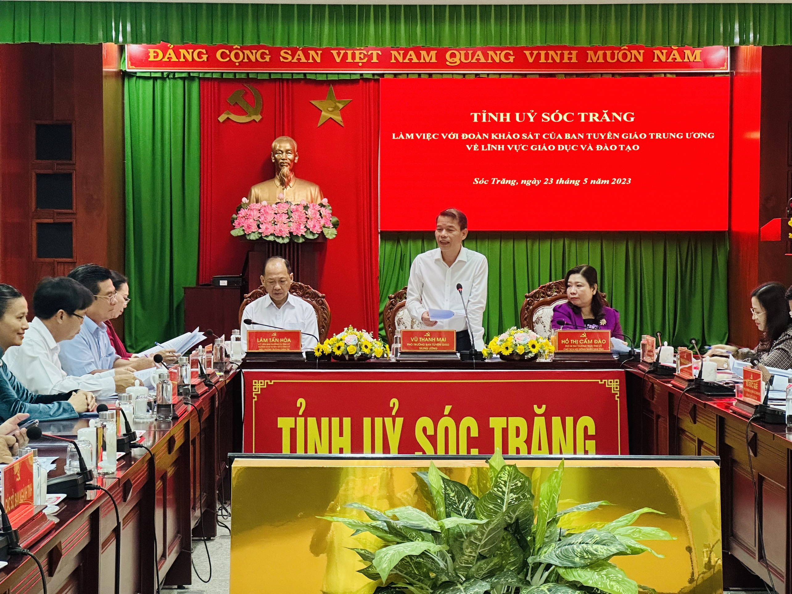 Chủ trì cuộc làm việc có các đồng chí: Vũ Thanh Mai, Phó Trưởng ban Tuyên giáo Trung ương; Hồ Thị Cẩm Đào, Phó Bí thư Thường trực Tỉnh ủy, Chủ tịch HĐND tỉnh Sóc Trăng; Lâm Tấn Hoà, Trưởng Ban Tuyên giáo Tỉnh ủy Sóc Trăng.