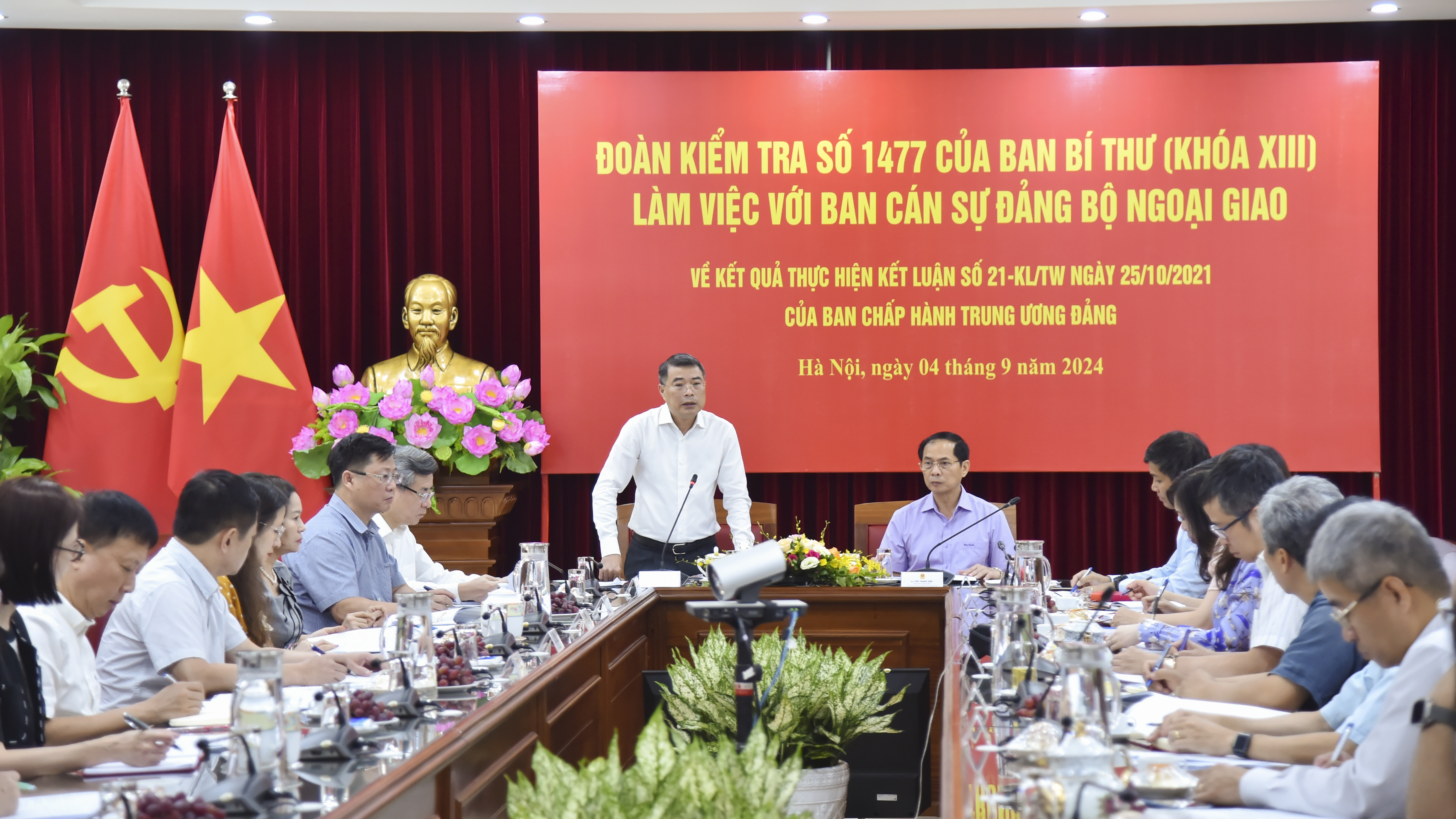 Chiều 04/9, tại Trụ sở Bộ Ngoại giao, Đoàn Kiểm tra số 1477 của Ban Bí thư do đồng chí Lê Minh Hưng, Ủy viên Bộ Chính trị, Bí thư Trung ương Đảng, Trưởng Ban Tổ chức Trung ương làm Trưởng đoàn đã làm việc với Ban cán sự đảng Bộ Ngoại giao. Tham dự buổi làm việc có các thành viên Đoàn kiểm tra và các Ủy viên Ban cán sự đảng Bộ Ngoại giao, đại diện cấp ủy một số tổ chức đảng của Bộ Ngoại giao.
