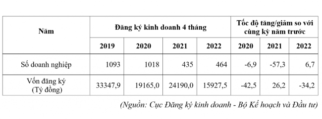 Theo thống kê, sau 2 năm ảnh hưởng của dịch COVID-19, các doanh nghiệp rất hào hứng với trạng thái bình thường mới. Nhiều chính sách của Quốc hội, Chính phủ được ban hành có tác động tích cực đến hoạt động sản xuất kinh doanh của doanh nghiệp trong nước nói chung và doanh nghiệp có vốn đầu tư nước ngoài (FDI) nói riêng. Số doanh nghiệp đăng ký thành lập mới lần đầu tiên chạm mốc 15 nghìn doanh nghiệp, nếu tính cả số doanh nghiệp quay trở lại hoạt động thì số doanh nghiệp tham gia thị trường trong tháng Tư gấp hơn 2 lần so với doanh nghiệp rút lui khỏi thị trường. Tính chung 4 tháng đầu năm 2022, số doanh nghiệp thành lập mới tăng 12,3% so với cùng kỳ năm 2021; số doanh nghiệp quay trở lại hoạt động tăng 60,6% và số doanh nghiệp hoàn tất thủ tục giải thể giảm 17,5%.