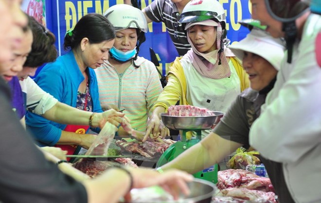 Người dân mua thịt lợn tại các cửa hàng thịt sạch, bình ổn giá. (Ảnh: Lê Xuân/TTXVN)