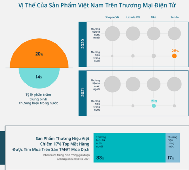 Theo iPrice Group, khảo sát thông qua việc đếm số lượt tìm kiếm và click vào sản phẩm, đơn vị đã phát hiện ra thực tế là trong top 1.200 mặt hàng được tìm mua nhiều nhất trên các sàn thương mại điện tử, sản phẩm mang thương hiệu Việt chỉ chiếm trung bình 17% trong năm 2020 và nửa đầu 2021. Ngược lại, có đến 83% số sản phẩm được quan tâm là hàng ngoại nhập.