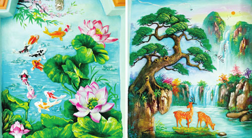 Gắn bó với công việc đắp tranh tường từ năm 2009 đến nay, ban đầu, anh chỉ đắp những công trình nhỏ tại nhà dân, dần dần, anh tích lũy kinh nghiệm, lãnh những công trình lớn tại các đình, chùa, miếu,... Anh Khải chia sẻ: “Công trình lớn đầu tiên tôi nhận là thi công ngôi đình gần nhà. Sau khi hoàn thành công trình, mọi người thấy đẹp nên đã giới thiệu tôi với nhiều khách hàng. Hiện tại, ngoài đắp tranh tường xi măng, tôi còn nhận thi công làm hòn non bộ, vẽ tranh tường cho các trường học, quán cà phê,... Đối với hòn non bộ, tôi sẽ thiết kế sẵn 4-5 mẫu theo không gian nhà của khách hàng, khách ưng ý mẫu nào thì tôi làm mẫu đó. Công việc này đòi hỏi sự sáng tạo, tôi phải thường xuyên học hỏi, cập nhật các xu hướng mới, kiểu dáng mới để đáp ứng yêu cầu của khách”.